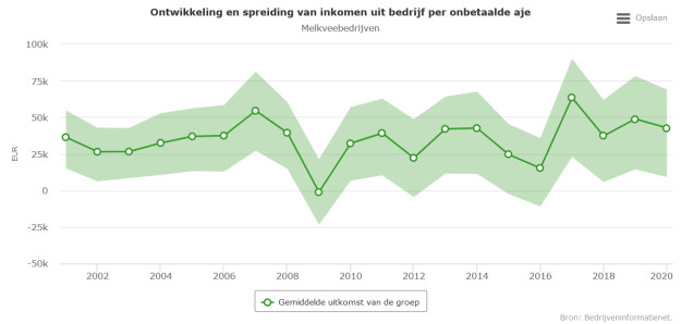 De inkomenscijfers van WUR zijn een gemiddelde. Daar omheen zit een grote bandbreedte van uiteenlopende inkomen. De onderste 20% van de bedrijven in de melkveehouderij ontving een negatief inkomen dat lager was dan -€1.000. De 20% met de hoogste inkomens verdiende meer dan €57.000 Deze laatste groep vertegenwoordigt wel tussen de 40% en 45% van de productie.
