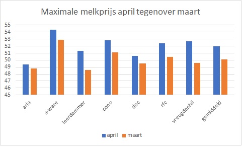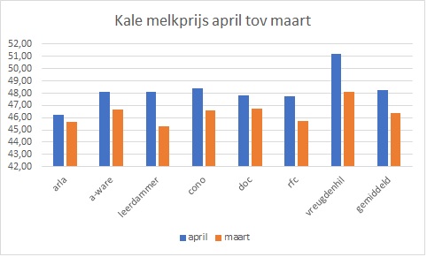Gemiddeld kwam de kale melkprijs over april uit op €48,23 per 100 kilo. Vreugdenhil Dairy Foods ging daar als hoogste betaler bijna €3,00 per 100 kilo overheen, Arla bleef daar bijna €2,00 onder.