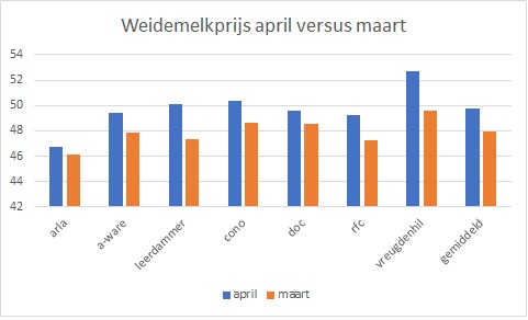 De gemiddelde weidemelkprijs bleef in april met €49,73 net iets onder de €50,00 per 100 kilo, maar er werd wel €1,83 meer betaald dan een maand eerder. Opmerkelijk is wel dat FrieslandCampina met zowel de weidemelkprijs als met de kale melkprijs onder de rekenkundig gemiddelde melkprijs voor april ligt. De gewogen gemiddelde melkprijs ligt dus ook iets lager dan hier vermeld.