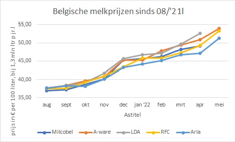Net als in Nederland heeft Arla relatief gezien de meeste moeite om het tempo van de prijzen bij te houden. FrieslandCampina is bezig zich enigszins te herpakken, terwijl Milcobel juist wat meer achterblijft ten opzichte van de twee koplopers. Dat zijn LDA en Royal A-ware. Zij betalen de hoogste prijzen uit.