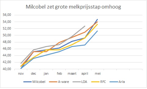 Zuivelcoöperatie Milcobel verhoogt de standaardmelkprijs voor de maand mei met een sprong. De raad van bestuur heeft tot deze verhoging besloten op grond van de sterke resultaten die Milcobel neerzet, zo wordt gemeld. Milcobel profiteert naar eigen zeggen goed van zowel de hoge prijzen voor zuivel op de internationale markten als van de sterke focus op efficiëntieverhoging en kostenverlaging.