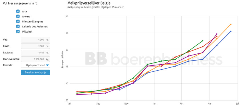 In de nieuwe vergelijker worden de actuele melkprijzen van de vijf grootste verwerkers in België vergeleken. Het gaat om, in alfabetische volgorde: Arla, A-ware, FrieslandCampina, Laiterie des Ardennes en Milcobel. De melkprijs van LDA over april komt uit op €52,70 per 100 liter. Dat is €1,76 meer dan A-ware betaalt en €3,50 meer dan Milcobel uitkeert over april. FrieslandCampina betaalt ongeveer hetzelfde bedrag (€49,25) uit als Milcobel.