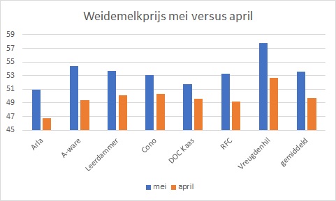 De weidemelkprijs ging in mei sterker omhoog dan de kale melkprijs, en wel met gemiddeld €3,92 per 100 kilo. Oorzaak daarvan is dat Royal A-ware vanaf mei tot en met juli voor weidemelk een extra seizoenstoeslag uitkeert van €2,00 per 100 kilo. Bij dit bedrijf steeg, na Vreugdenhil, de weidemelkprijs over mei dan ook het sterkst.