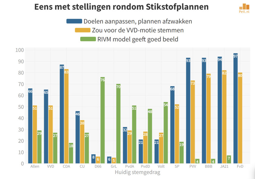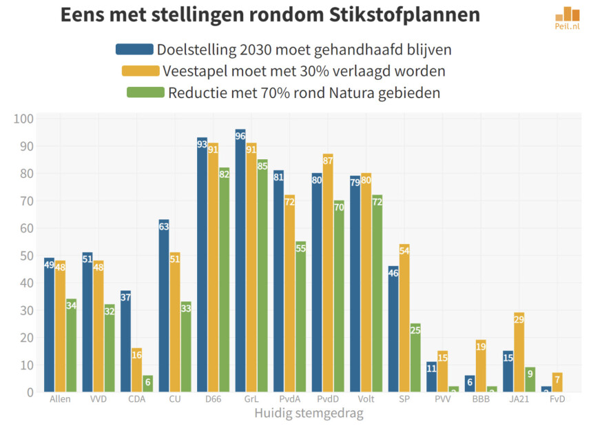 Een nipte meerderheid van 51% is het niet eens het doel dat de uitstoot van stikstof met 50% teruggedrongen moet zijn in 2030. De linkerflank (D66, GroenLinks, PvdA, Volt, PvDD) is overtuigend voor dit doel. Opvallend is dat de VVD-kiezer ook nipt voor is (51%), terwijl 37% van de CDA-kiezers achter dit doel staat. De kiezer van BBB (6%) is het overtuigend niet eens om dit doel te halen, net als die van de PVV, JA21 en Forum voor Democratie. Een eveneens kleine meerderheid van 52% vindt dat de veestapel niet met 30% hoeft te worden verlaagd, wat volgens Van der Wal het effect gaat zijn van haar stikstofbeleid. Tweederde van de keizers (66%) is van oordeel dat de stikstofuitstoot rond Natura2000-gebieden niet met 70% hoeft te worden gereduceerd, wat een soepeler beleid aldaar voor agrarische ondernemers impliceert.