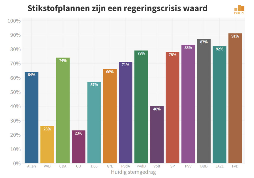 Wat ook opvalt, is dat bijna tweederde van de kiezers (64%) vindt dat het stikstofbeleid een regeringscrisis waard is. Alleen de kiezer van de VVD en ChristenUnie is hier niet voor te porren, bijna alle andere partijen - en dan vanzelfsprekend zeker ook de oppositiepartijen - wel. Kenmerken is dat 57% van de kiezers van D66 de stikstofplannen een kabinetscrisis en dus eventueel nieuwe verkiezingen waard vinden. In de huidige coalitie staat D66 vooralsnog alleen in het volharden van de uitvoer van het huidige stikstofplan. De leden van de VVD hebben voor aanpassing gestemd en het CDA en ChristenUnie willen eigenlijk pas oordelen over het 'boerenplan' als ook alle andere stikstofplannen voor onder meer de industrie, Schiphol en de woningbouw bekend zijn.
