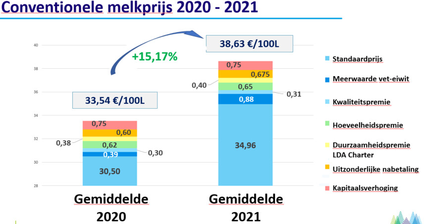 LDA zat vorig jaar ook qua omzet behoorlijk in de groei. In totaal werd voor €697 miljoen verkocht, wat ruim 15% meer was dan in het jaar ervoor. De bruto winst steeg van €2,75 miljoen naar €5,9 miljoen. Belangrijker voor de coöperatie was de hogere melkprijs die kon worden uitbetaald. Deze steeg van €33,54 in 2020 naar €38,63 per 100 liter in 2021, wat neerkomt op ruim 15% meer melkgeld.