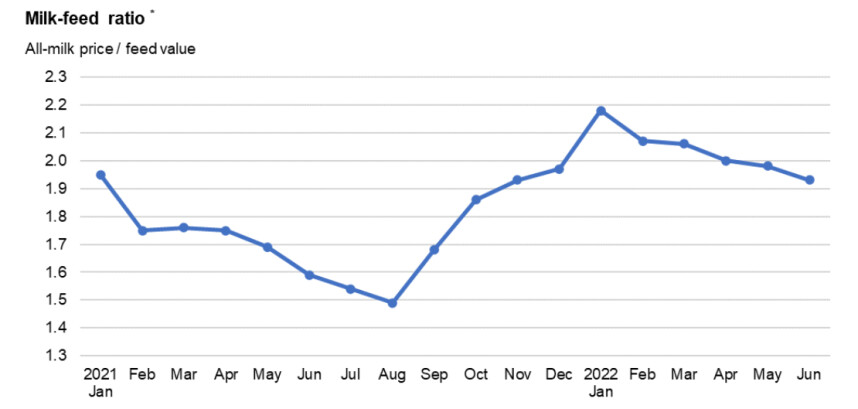 Dat is de beste melkprijs sinds 2014 en heel wat meer dan de laatste jaren is ontvangen. Alleen in 2019 kwam de melkprijs boven de $18,00 per pound uit. Nu zegt melkprijs alleen niet zo heel veel. Het gaat tenslotte om wat er overblijft na betaling van alle rekeningen. Daarom wordt in de VS veel gekeken naar de melk/voer verhouding, want de voerkosten tikken het hardst aan. De genoemde melk/voer verhouding was in januari met een factor van 2.20 het hoogst. De melkprijs was toen nog niet op recordhoogte, maar de voerkosten waren dat ook nog niet. Sindsdien is genoemde indicator gestaag verslechterd.