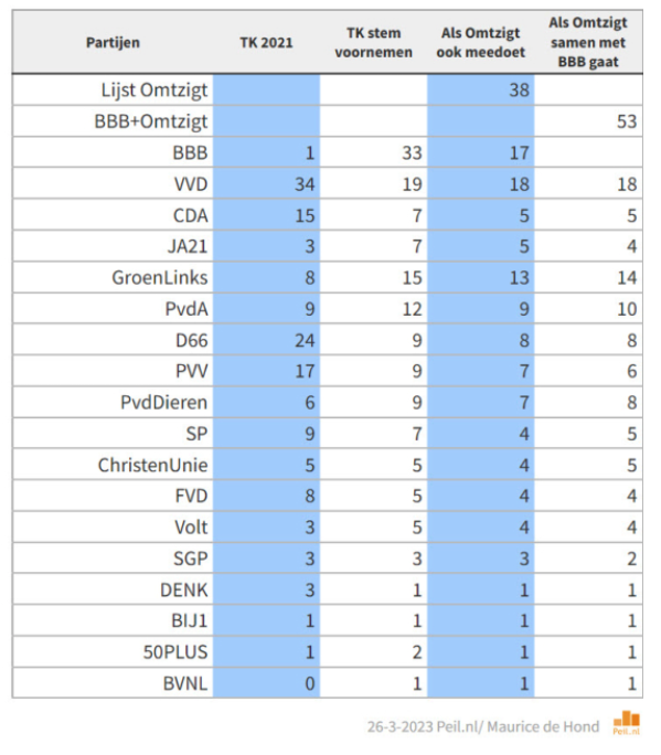 Als Pieter Omtzigt zich aansluit bij de BoerBurgerBeweging en er nu Tweede Kamerverkiezingen worden gehouden, haalt BBB meer dan een derde van alle zetels halen: 53. Dat blijkt uit de jongste peiling van Maurice de Hond.