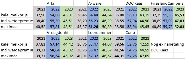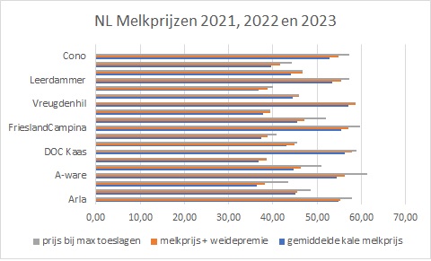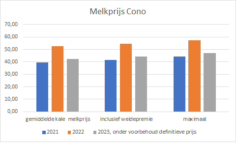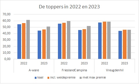 In 2021 was Cono nog wel de top-betaler van melkgeld, zowel voor wat betreft de kale melkprijs, de weidemelkprijs als de maximale melkprijs. In 2022 werd de Noord-Hollandse coöperatie van de troon gestoten en nam Vreugdenhil het voortouw over voor wat betreft de kale melkprijs en de weidemelkprijs. Collega-bedrijf A-ware betaalde toen de hoogste melkprijs inclusief toeslagen. Dit jaar voert FrieslandCampina de ranglijst dus aan, dankzij de sterk gestegen PlanetProof-toeslagen. Helaas zijn die wel alleen voor een kleine minderheid van alle leden.