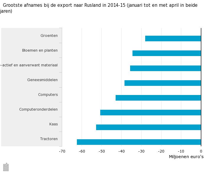 In een jaar tijd is het Russische aandeel in de Nederlandse goederenexport gedaald van 1,43 procent naar 0,89 procent. Daarmee daalt Rusland als exportbestemming van Nederland van de 12e naar de 19e plek. Exporteurs van trekkers hebben voor 62,6 miljoen euro minder uitgevoerd naar Rusland, de kaashandel lijdt een omzetverlies van bijna 53 miljoen euro aan misgelopen export naar Rusland ten opzichte van de eerste vier maanden van vorig jaar.