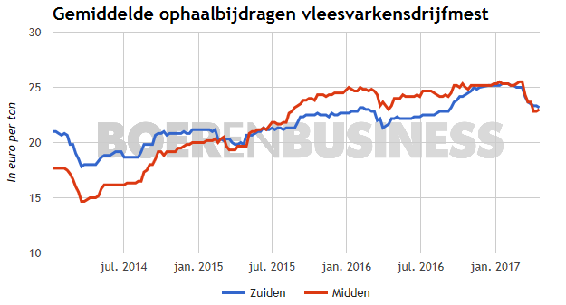 Ook de varkensmestprijzen blijven nagenoeg gelijk aan vorige week. In regio midden stijgen de ophaalbijdragen naar 23 euro per kuub. Voor regio zuid geldt een minime daling van 13 cent, ten opzichte van vorige week, naar 23,17 euro per kuub.