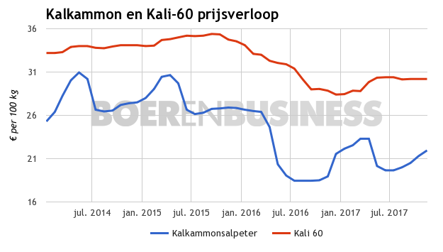 Agrifirm Plant bemerkt nog geen grote vraag, alhoewel de eerste inkopen al wel gedaan zijn. Het bedrijf ziet dat de prijs voor kalium behoorlijk stabiel tot licht stijgend is. Stikstof is de belangrijkste prijsopduwer. De gemiddelde stikstofprijs over 2017 is met 10% gestegen, ten opzichte van 2016. Hiermee komt een prijsdaling, die 5 jaar voortduurde, tot stilstand.