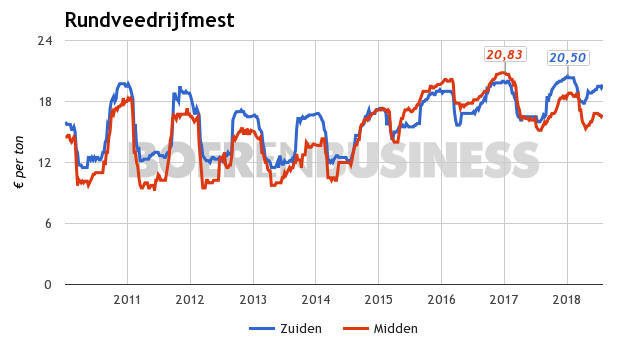 In de afzet van rundveedrijfmest is de situatie niet veel beter. Ook daar liggen de prijzen veel hoger dan in andere jaren het geval was. Zo noteert DCA voor de regio Midden €16,67 per ton en komt de prijs in regio Zuid uit op €19,67 per ton.