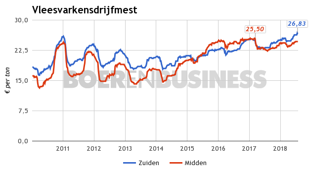 De ophaalbijdragen voor vleesvarkensdrijfmest in het zuiden van Nederland tikten 1 week eerder het hoogste punt sinds 2010 aan. In week 30 zakt de prijs weer terug naar €26,67 per ton, maar dat is nog steeds een extreem hoog niveau (met name voor de zomerperiode). In het midden van het land bevindt de prijs zich op €24,67 per ton, wat in lijn is met de prijzen in 2016.