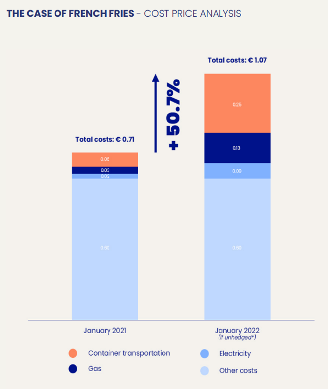 Laten we een eenvoudig voorbeeld gebruiken om de gevolgen voor de kostprijs te kwantificeren. De productie van frites is een grondstofintensief proces: naast de aardappelen, die de grootste kostenpost voor frites vormen (ongeveer 50%), zijn de belangrijkste kosten gas, energie en containervervoer. Deze drie componenten maken slechts 15% uit van de normale kostprijs van een kilogram frites, maar de kosten ervan zijn aanzienlijk gestegen. Tegen de huidige marktprijzen laten deze drie factoren de totale kostprijs met 50% stijgen.