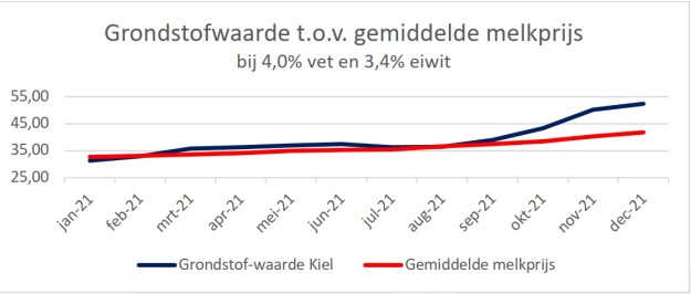 Dus ook als je beide effecten meeweegt, is de uitbetalingsprijs van de Nederlandse zuivelindustrie over 2021 nagenoeg gelijk aan de Kieler grondstofwaarde.