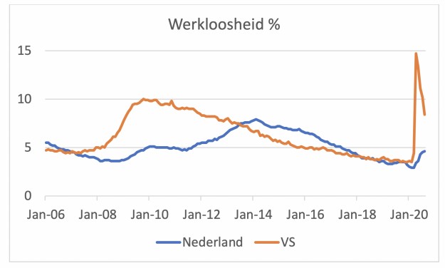 De volgende grafiek laat aardig zien hoe de ontwikkeling van de werkloosheid in ons land afwijkt van de ontwikkeling in de VS.