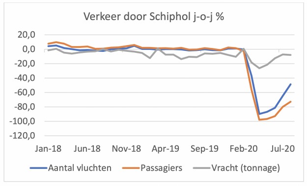 Het aantal vluchten van en naar Schiphol lag in augustus nog altijd bijna 50% lager dan een jaar eerder. Dat is natuurlijk wel beter dan de -89,9% van april, maar het blijft een stevige min. Het aantal passagiers dat in augustus door Schiphol kwam lag nog altijd 72,8% lager dan in augustus 2019.