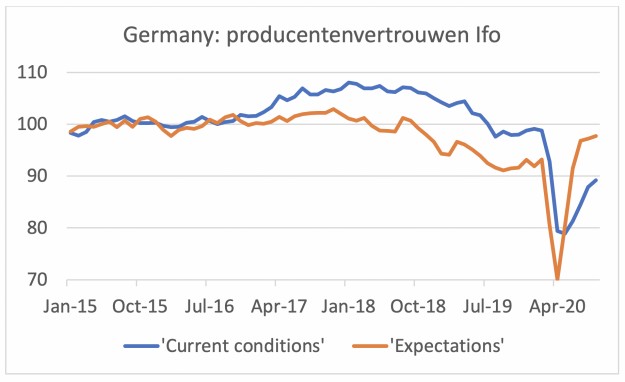 Of het dan om nieuwe restricties op het openbare leven gaat of dat mensen hun gedrag direct veranderen als ze te horen krijgen over toenemende aantallen besmettingen, weet ik niet. Het doet er ook niet echt toe. De cijfers suggereren dat de voortgang van het economisch herstel afhankelijk is van het onder controle houden van het virus. Overigens is de huidige stand van het ondernemersvertrouwen in de dienstensector wel veel hoger dan het dieptepunt in april. Dat was 12 (op een schaal van 0 tot 100).
