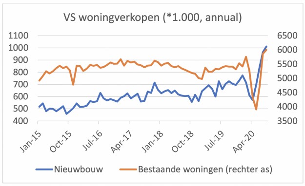 Juist wel crescendo gaat het op de huizenmarkt. Dat is een wonderlijk verschijnsel dat zich in deze crisis ook elders manifesteert. Bij ons bijvoorbeeld. De volgende grafiek laat zien dat zowel het aantal verkochte nieuwbouw als bestaande woningen in augustus het hoogste aantal in jaren bereikte. Het lijkt erop dat er een behoorlijke tweespalt in deze crisis ontstaat, tussen mensen die een veilige baan en inkomen hebben en zij die dat niet hebben.