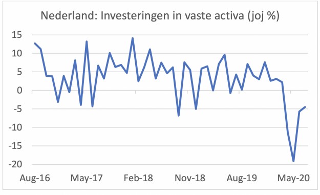Het CBS publiceerde deze week een aantal indicatoren over de Nederlandse economie. Voor de toekomstige groei is het van belang dat bedrijven (blijven) investeren. In de crisis waren de investeringen in materiële vaste activa eerder dit jaar sterk teruggevallen. Het dieptepunt lag in mei volgens het CBS met een min van 20% ten opzichte van een jaar eerder. Inmiddels is sprake van verbetering, maar de investeringen lagen in juli nog altijd bijna 5% lager dan een jaar eerder.