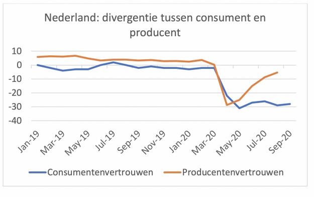 Zoals ik al eerder heb opgemerkt - en in lijn met andere landen - is sprake van een opvallende divergentie tussen het vertrouwen onder consumenten en dat onder ondernemers. Het consumentenvertrouwen in ons land was in september een fractie hoger dan in augustus: -28 tegen -29. Feitelijk stabiliseert het consumentenvertrouwen al maanden op een laag niveau. Het producentenvertrouwen daarentegen verbetert wel, al is daarover nog geen septembercijfer gepubliceerd door het CBS.