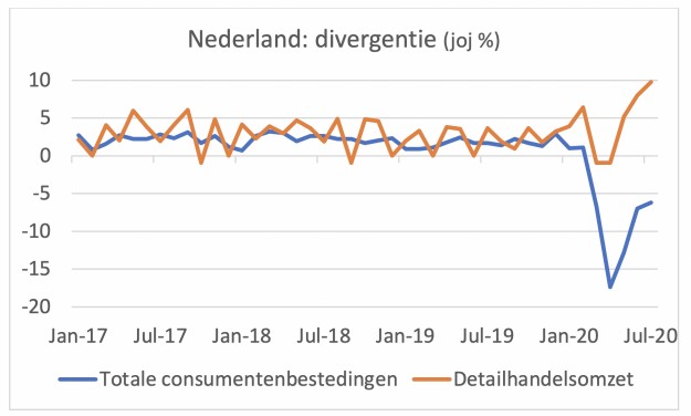 Het patroon van de particuliere consumptie is behoorlijk van slag. De volgende grafiek brengt de divergentie in beeld tussen de groei van de detailhandelsomzet en de totale consumptieve uitgaven. Het verschil tussen beide wordt gevormd door consumptieve uitgaven aan diensten. Die hebben dus zwaar te lijden onder de coronacrisis en de 'anderhalve meter'.