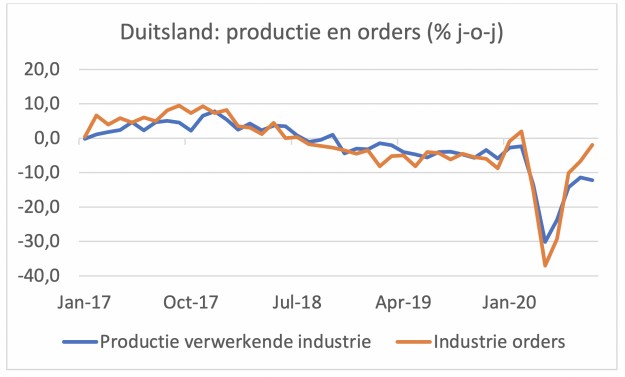 De Duitse economie profiteert wellicht van de combinatie van Chinees herstel en verbeterende investeringen in de VS. De Duitse economie is immers meer afhankelijk van export naar China dan de meeste andere Europese landen en de kapitaalgoederenindustrie is in Duitsland ook belangrijker dan elders. Recente cijfers over de Duitse industriële productie vielen tegen, maar cijfers over fabrieksorders waren juist bemoedigend.