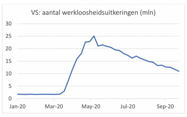 In de week tot 3 oktober werden 840.000 nieuwe aanvragen gedaan voor uitkeringen, slechts fractioneel lager dan een week eerder. Je wilt eigenlijk dat het aantal harder daalt. Geen reden dus voor veel optimisme. Anderzijds daalde het totale aantal werkloosheidsuitkeringen van 12,0 miljoen naar 11,0 miljoen in de week tot 26 september. Dat was dan wel weer bemoedigend.