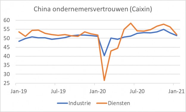 Deze week publiceerde Caixin de resultaten van hun maandelijkse enquête naar het ondernemersvertrouwen in januari. Zowel in de industrie als in de dienstensector was het vertrouwen in de loop van 2020 fors hersteld na de klap van februari/maart, maar in december was het vertrouwen volgens deze maatstaven iets gedaald. In januari zette die daling versneld door: in de industrie ging de Caixin index van 53,0 naar 51,5. In de dienstensector ging het van 56,3 naar 52,0. Dat zijn best behoorlijke dalingen. Het niveau van deze indices is geen reden tot zorg, maar gelet op het feit dat we een herstelproces van een pandemie (dat bovendien a-synchroon verloopt) in de wereld nog niet eerder hebben meegemaakt, is het toch opletten geblazen. Zeker als je anekdotische signalen krijgt die een ander beeld schetsen dat de officiële cijfers tot dan toe.