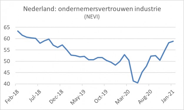 Eerder had het CBS al gerapporteerd dat het ondernemersvertrouwen in de industrie in ons land in januari verder was verbeterd. Deze week kwam ook de NEVI met cijfers over het producentenvertrouwen in de industrie in januari. De NEVI-index steeg van 58,2 in december naar 58,8. Wat mij vooral opviel, waren delen van de tekst van het bijbehorende persbericht. De logistieke problemen die de compagnon van mijn Brabantse vriend in Azië meent te constateren, komen ook tevoorschijn in het NEVI-persbericht. Hier een korte bloemlezing: 'more pressure on already-stretched supply chains'; 'delivery times lengthening markedly again'; 'ongoing supply disruptions'. Ook rapporteren ondernemers een versnelling van prijsstijgingen, die verband houden met 'raw material shortages, higher transportation fees and supplier price hikes'.