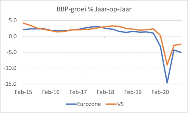 Eurostat publiceerde deze week ook voorlopige BBP-cijfers over het vierde kwartaal. Terwijl in de VS het BBP in het vierde kwartaal nog met 1% (4,0% geannualiseerd) is gegroeid, is het BBP in de eurozone juist met 0,7% gedaald. De jaar-op-jaar mutatie bedroeg -5,1% tegen -2,5% voor de VS. De grafiek laat mooi zien dat de Europese groei al in 2018 onder de Amerikaanse is gedoken. De potentiële groei in Europa is lager dan in de VS, maar vooral diverse problemen in de Duitse industrie speelden de eurozone toen parten. De meer recente 'underperformance' heeft met de coronacrisis te maken.