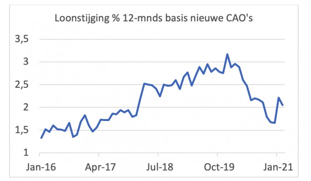 In ons eigen land is daar vooralsnog bepaald geen sprake van. De AWVN berekent cijfers over de loonstijging die vervat zit in juist afgesloten CAO's. Vorig jaar daalde dat stijgingstempo opmerkelijk snel en stevig nadat de pandemie was uitgebroken. In januari dit jaar leek er sprake van enige versnelling, maar die is in februari weer teruggevallen.