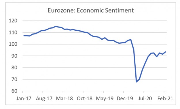 De 'Economic Sentiment' indicator voor de eurozone zoals door de Europese Commissie wordt samengesteld, steeg in februari tot 93,4 van 91,5 in januari. Voor Nederland daalde deze indicator juist iets in februari. Het vertrouwen is duidelijk hersteld van de klap vorig jaar, maar blijft nog stukken lager dan voor de pandemie.