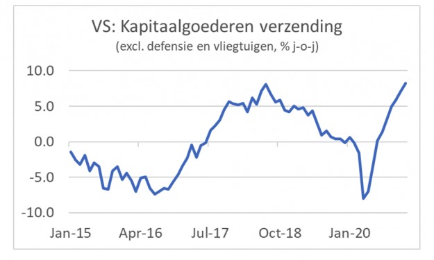 Van de in de VS deze week gepubliceerde cijfers gaat mijn aandacht het meest uit naar de orders voor duurzame goederen en in het bijzonder naar de 'verzending van kapitaalgoederen (exclusief defensie en vliegtuigen)'. Deze reeks geeft een goed beeld van het investeringsgedrag van ondernemers. Na een aanvankelijke klap toen de pandemie uitbrak vorig jaar is hier sprake van en opmerkelijk herstel.