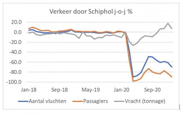 Terwijl de aantallen vluchten en passagiers veel lager zijn dan een jaar geleden, is het vrachtverkeer juist gegroeid. Dat laat zien dat we toch meer 'spullen' gebruiken. Die cijfers zijn consistent met de wereldhandel. Misschien profiteert de luchtvaart ook wel van de problemen in de zeescheepvaart. Als vuistregel kan je aanhouden dat in volume ongeveer 10% van de wereldhandel door de lucht gaat en 30% in waarde.