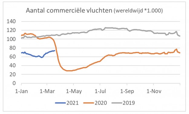 Dat het buiten Europa beter gaat, blijkt uit het volgende plaatje dat het aantal commerciële vluchten wereldwijd laat zien. Daar is de laatste weken duidelijk sprake van enige verbetering. Die verbetering komt vooral door de VS en Azië.