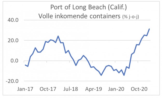 En dat de handel tussen de VS en China aantrekt, blijkt uit de cijfers van de havenautoriteit van Long Beach, de op één na grootste containerhaven in de VS. Het aantal binnenkomende volle containers (in TEUs, 20-ft equivalent units) lag in februari ruim 50% hoger dan een jaar eerder. In de volgende grafiek staat het 3-maands voortschrijdend gemiddelde afgebeeld.