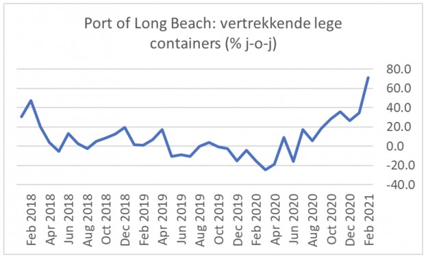 De logistieke verstoringen in de wereld zijn bekend. Containers staan niet op de plaats waar ze nodig zijn. Dat heeft geleid tot exorbitant hoge vrachtprijzen en tot problemen met leveringen. De oplossing is uiteraard het verslepen van lege containers. Het volgende plaatje suggereert dat dat proces gaande is. Het aantal lege containers dat uit de haven van Long Beach vertrok, was in februari ruim 71% hoger dan een jaar eerder. (Ook onder normale omstandigheden vertrekken er veel lege containers uit Long Beach, doordat de VS een groot handelstekort heeft met Azië).