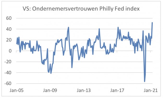Diverse indicatoren geven inmiddels blijk van een groeiversnelling. De zogeheten Philly Fed index, een maatstaf van het ondernemersvertrouwen in het district van de Philadelphia Fed, steeg in maart naar 51,8 van 23,1 in februari. Het maartcijfer was het hoogst in 50 jaar. De stijging werd vooral gedragen door een veel positievere blik van ondernemers op hun orderpositie.