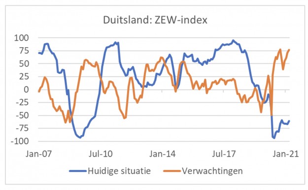 De Europese economie is duidelijk zwakker. De EU ligt een stuk achter met de uitrol van de corona vaccinaties. Desondanks verbeterden in Duitsland in maart de 2 belangrijkste reeksen van de zogeheten ZEW-index. Deze meet het vertrouwen in de economie onder analisten. De beoordeling van de huidige situatie blijft fors negatief, maar steeg wel van -67,2 in februari naar -61,0. En de verwachtingen omtrent het herstel zijn hooggespannen. Die reeks steeg van 71,2 naar 76,6.