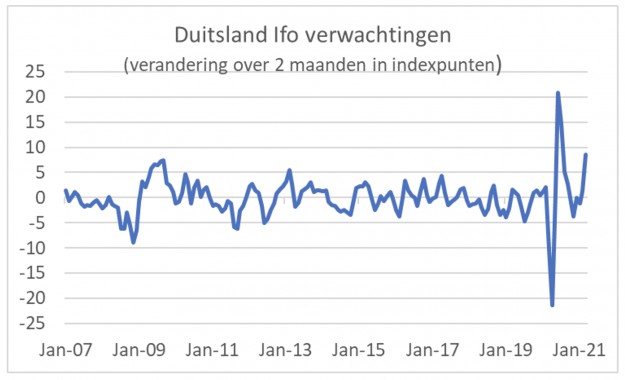 Het meest opvallend deze week waren de diverse cijfers over het producentenvertrouwen, vooral die in Europa. De voorlopige cijfers van Markit lieten voor de Europese landen waar de cijfers voor maart zijn gepubliceerd. Zowel in Duitsland, Frankrijk, Italië, de eurozone en het VK zijn opmerkelijke verbeteringen zien. De nog wat meer gerenommeerde Duitse Ifo-index bevestigde dat beeld. Nu zijn de enquêtes waarop de cijfers zijn gebaseerd, gehouden voordat in de diverse landen de lockdowns zijn verlengd. Die verlenging kan echter nauwelijks een verrassing zijn geweest.