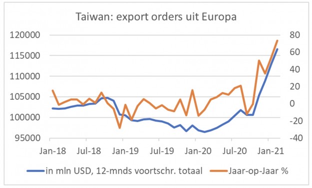 Taiwanese exportorders geven daarvoor een indicatie, doordat Taiwan een belangrijke exporteur is van micro-electronica. De exportorders van dat land lagen in februari 48,5% hoger dan een jaar eerder. Orders uit Europa namen zelfs 73,4% toe en de belangrijkste drijver hier achter waren elektronische producten. Natuurlijk zijn februari-cijfers van Taiwan soms lastig te interpreteren, in verband met Chinees nieuwjaar en nu ook door zogeheten basiseffecten. Vorig jaar sloeg de pandemie immers in Azië in februari al toe.