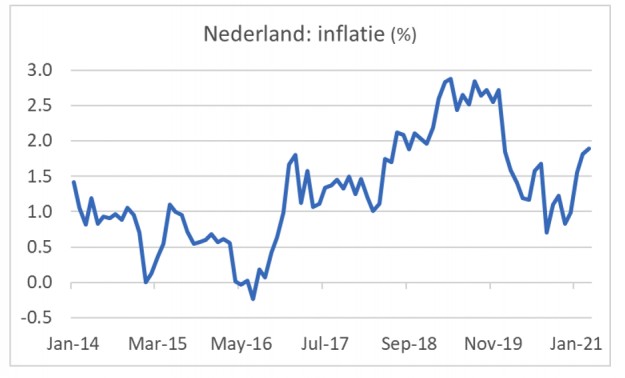 De inflatie in ons land is inmiddels opgelopen tot 1,9% jaar-op-jaar in maart, iets meer dan de 1,8% in februari. Het CBS meldt overigens dat voor 6% van de index een schatting is gemaakt, omdat er door de beperkingen op het openbare leven geen feitelijke meting mogelijk is. Dat geldt bijvoorbeeld voor buitenlandse pakketreizen.
