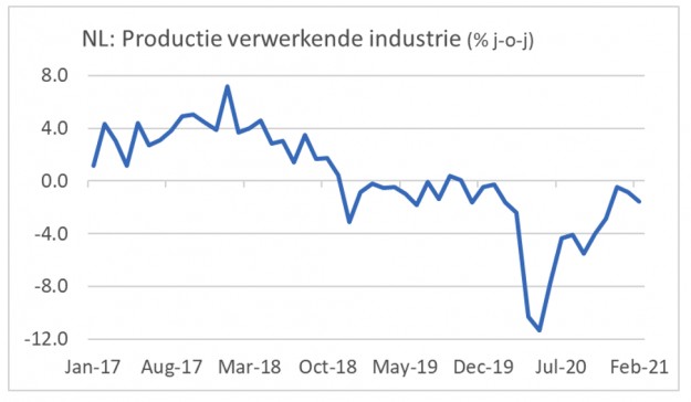 Het volgende plaatje laat zien dat de verbetering van de productie gemeten aan de jaar-op-jaar vergelijking al 2 maanden stokt in ons land. Vanaf hier gaat het met deze reeks overigens een stuk beter, maar dat is dan primair een basiseffect doordat de productie vorig jaar in maart een klap kreeg.
