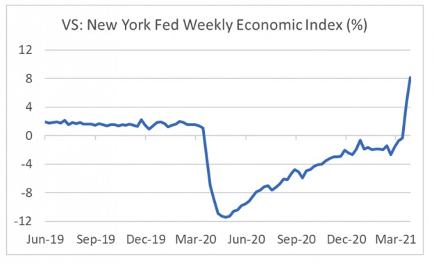 Een jaartje geleden ontwikkelden economen van de New York Fed een wekelijkse maatstaf die de economische groei (jaar-op-jaar) moest aangeven, de 'Weekly Economic Index'. De laatste weken spuit die omhoog. Volgens de laatste waarneming, die gaat over de eerste week van april, bedraagt de jaar-op-jaar economische groei 8,1%.