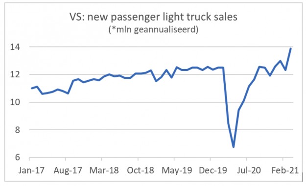 Wie de Amerikaanse conjunctuur volgt, kijkt regelmatig naar de verkoop van nieuwe 'light trucks', een segment voertuigen dat in Europa veel kleiner is. De Amerikanen hebben die prachtige 'pick-up trucks', wij hebben 'bestelbusjes'. De verkoopcijfers van die 'light trucks' geven doorgaans interessante signalen over de conjunctuur. Als sprake is van een stijging, dan trekt de conjunctuur aan. Het volgende plaatje laat zien dat die verkopen zich behoorlijk herstellen. Hier lopen de cijfers tot en met maart.