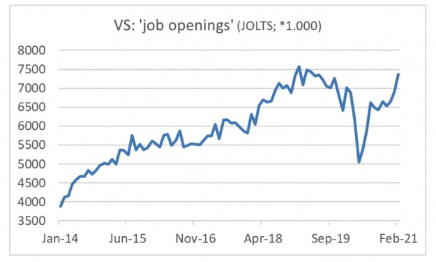 Een en ander vertaalt zich ook naar de arbeidsmarkt. Het Amerikaanse ministerie van Arbeid publiceert maandelijks de resultaten van de Job Openings and Labour Turnover Survey (JOLTS). In de pandemie daalde het aantal openstaande vacatures uiteraard scherp. Herstel kwam echter snel. In loop van het tweede deel van 2020 stokte de verbetering, maar de laatste maanden is weer sprake van een sterke stijging. Daar kun je maar één conclusie uit trekken: er begint behoorlijk leven te komen in de Amerikaanse arbeidsmarkt.
