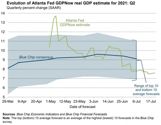 Zoals gezegd is de inflatie in de VS veel meer opgelopen dan bij ons. In juni bedroeg de Amerikaanse inflatie 5,4%. Dat hakt erin wat betreft de koopkracht. De Atlanta Fed rekent op basis van dagelijks beschikbaar komende macrocijfers uit hoe hoog de economische groei in het lopende kwartaal is. Een dergelijke grootheid wordt wel 'nowcast' genoemd (ter onderscheiding van 'forecast') en de Atlanta Fed noemt de eigen grootheid 'GDPNow'. De groene lijn in de onderstaande grafiek laat het verloop voor het tweede kwartaal zien vanaf begin mei. De hoogste taxatie voor economische groei in het tweede kwartaal bedroeg 13,7% (dat is de geannualiseerde groei ten opzichte van het eerste kwartaal), maar dat is inmiddels gedaald naar 7,6%. In de loop van het tweede kwartaal is het tempo van de economische groei volgens deze maatstaf dus behoorlijk getaand. De blauwe lijn is het gemiddelde van een groot aantal voorspellers uit de particuliere sector. Als de Atlanta Fed gelijk heeft, zullen de economen in meerderheid teleurgesteld worden wanneer het groeicijfer wordt gepubliceerd.