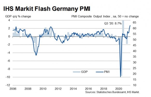 Nu moet ik direct opmerken dat de industrie slechts een klein deel van de moderne economie uitmaakt. Door de pandemie is de dienstensector ongekend sterk getroffen en de normalisering van het openbare leven geeft vooral die sector een impuls. De voorlopige cijfers over het ondernemersvertrouwen over juli zoals die door IHS Markit worden samengesteld schetsen voor Duitsland nog altijd een zeer positief beeld, zoals blijkt uit de volgende grafiek.